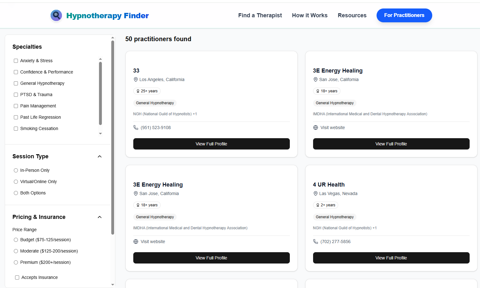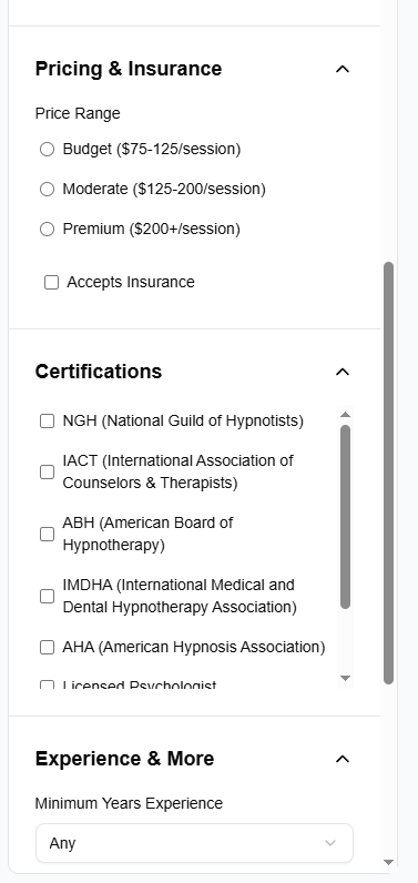 Unlike basic directories, Hypnotherapy Finder's advanced filtering system allows users to search by highly specific criteria: specialty, gender, price, insurance accepted, credentials/qualifications, session type (in-person or telehealth), experience level, and more. This level of granularity ensures every user finds a practitioner perfectly tailored to their unique needs.