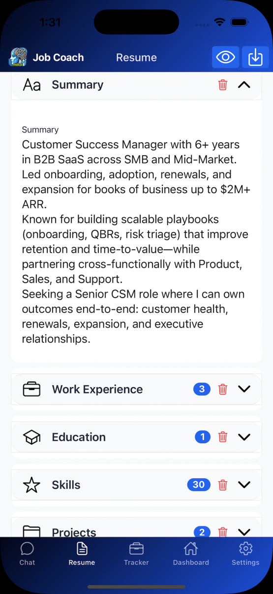 Structured resume tailoring, application tracking, and mock interviews; all in 15 on-device languages from day one. Built for the AI hiring era.