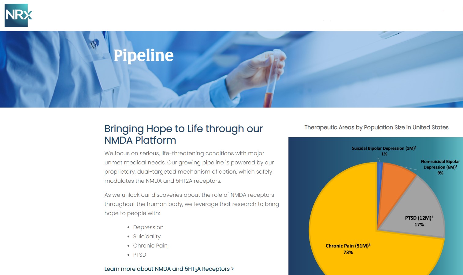 NRx Pharmaceuticals, Inc. (N A S D A Q: NRXP) is a clinical-stage biopharmaceutical company developing therapies based on its NMDA platform for the treatment of central nervous system disorders including suicidal bipolar depression, chronic pain, and PTSD.