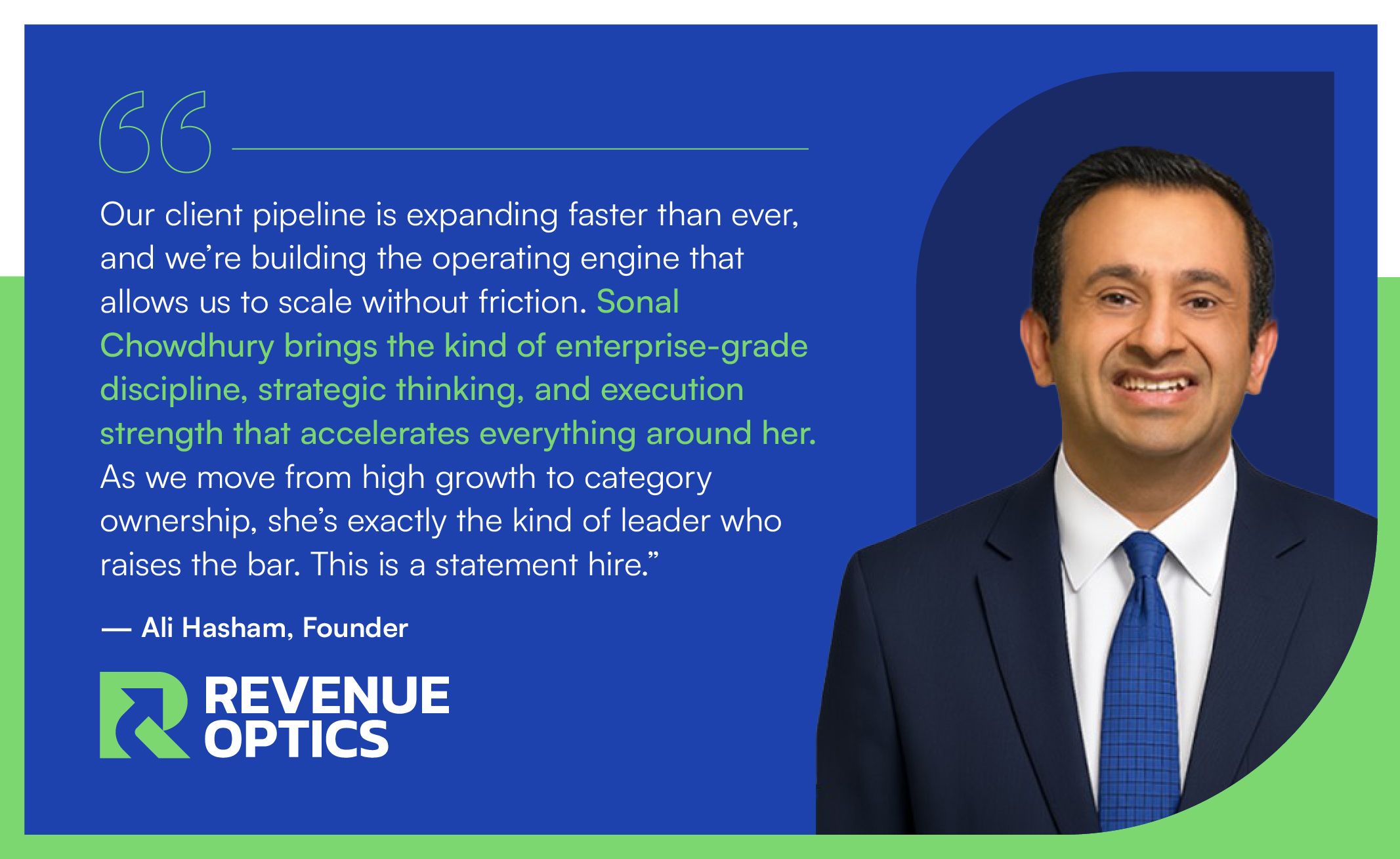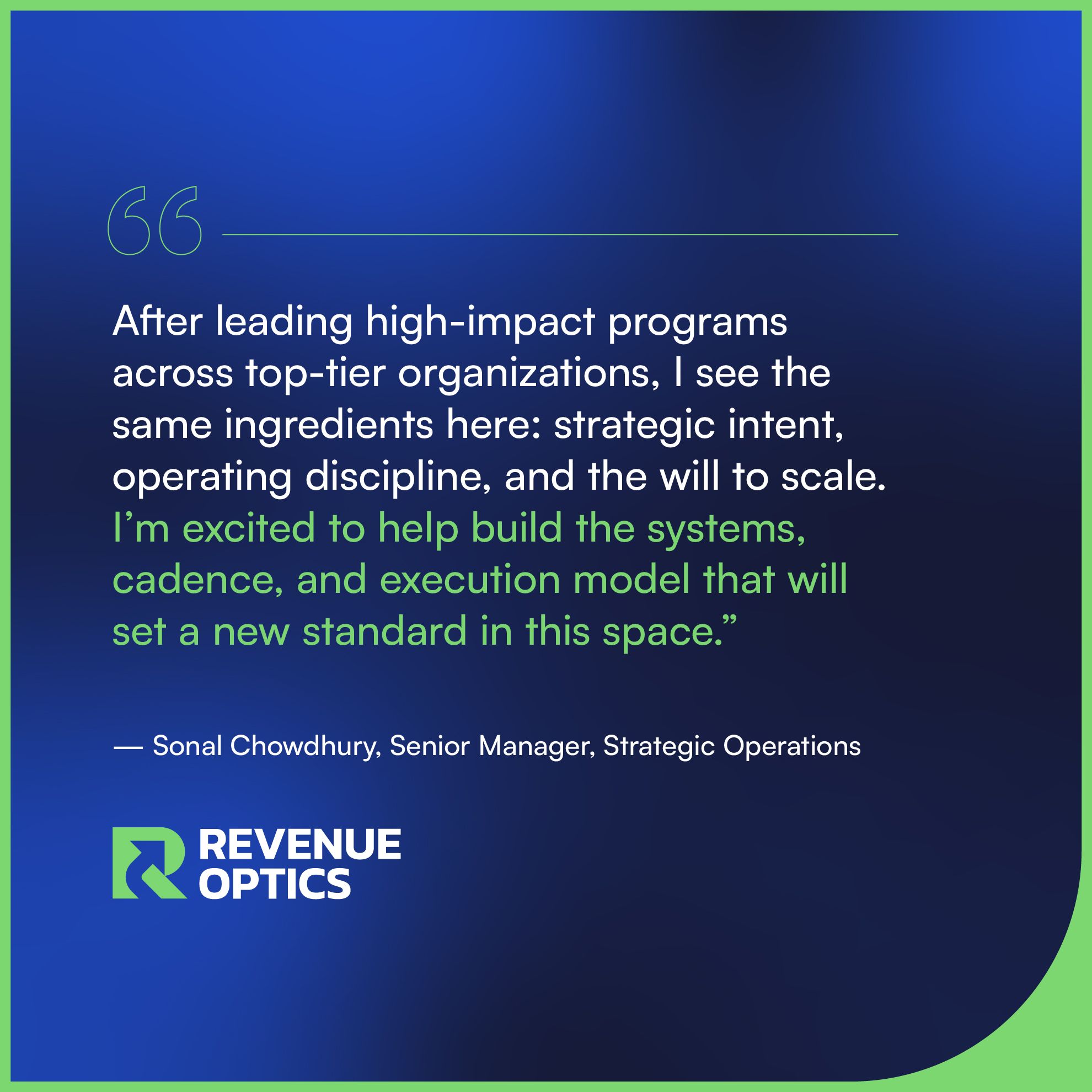 MEMPHIS, Tenn. - ncarol.com -- Revenue Optics, the fastest-emerging consultancy redefining inside-sales transformation for the North American B2B distribution sector, today announced the appointment of Sonal Chowdhury as Senior Manager – Strategic Operations. This hire marks a step-change in the firm's operating maturity and reinforces its accelerated path toward category leadership.