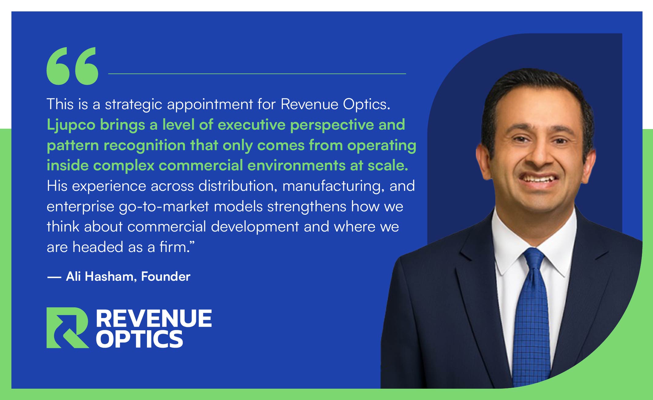 "This is a strategic appointment for Revenue Optics," said Ali Hasham, Founder and CEO of Revenue Optics. "Ljupco brings a level of executive perspective and pattern recognition that only comes from operating inside complex commercial environments at scale. His experience across distribution, manufacturing, and enterprise go-to-market models strengthens how we think about commercial development and where we are headed as a firm."