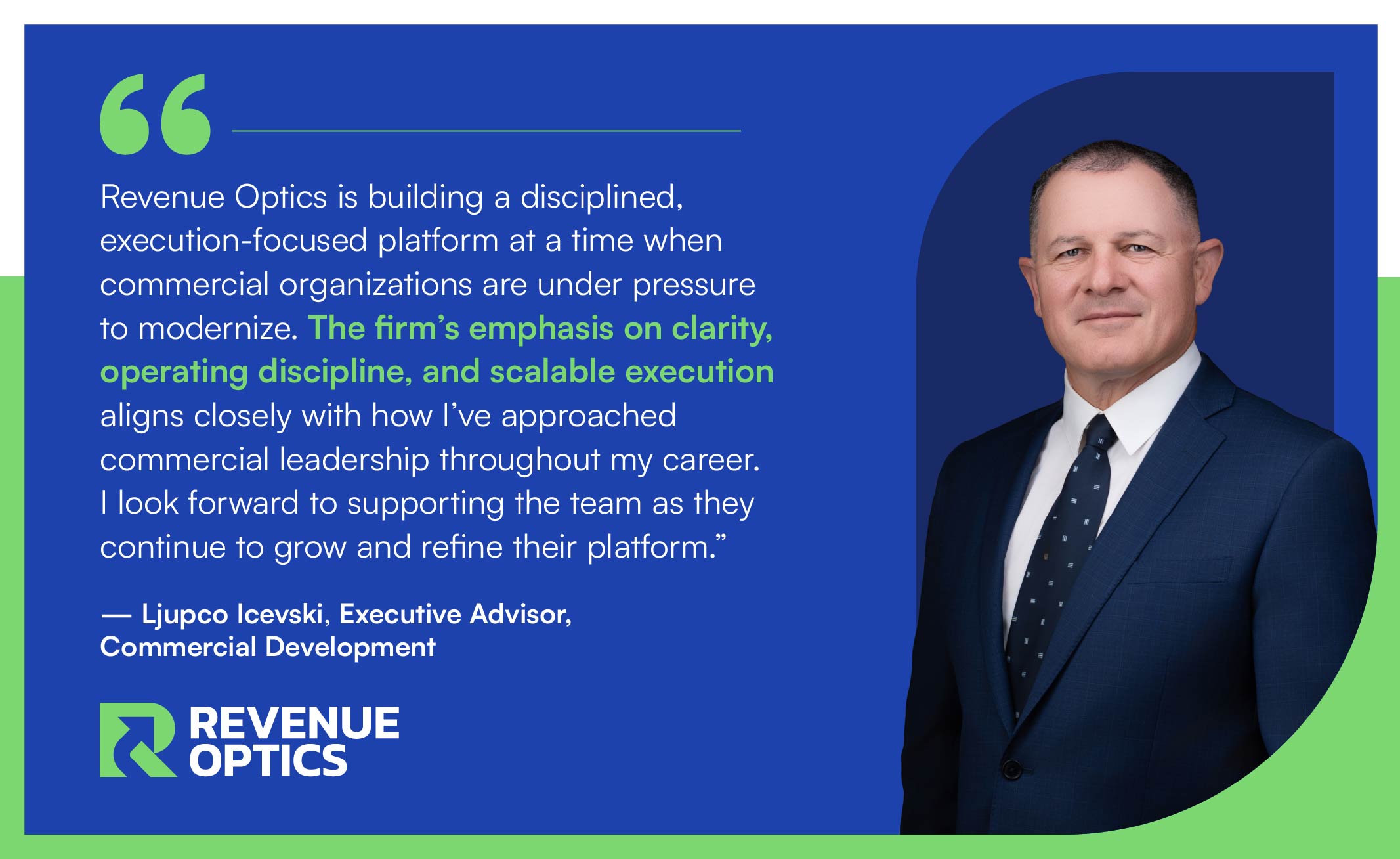 "Revenue Optics is building a disciplined, execution-focused platform at a time when commercial organizations are under pressure to modernize," said Ljupco Icevski. "The firm's emphasis on clarity, operating discipline, and scalable execution aligns closely with how I've approached commercial leadership throughout my career. I look forward to supporting the team as they continue to grow and refine their platform."