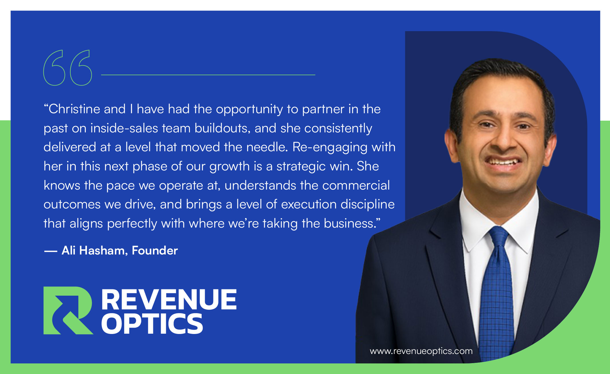 "Christine and I have had the opportunity to partner in the past on inside-sales team buildouts, and she consistently delivered at a level that moved the needle," said Ali Hasham, Founder & CEO of Revenue Optics. "Re-engaging with her in this next phase of our growth is a strategic win. She knows the pace we operate at, understands the commercial outcomes we drive, and brings a level of execution discipline that aligns perfectly with where we're taking the business."
