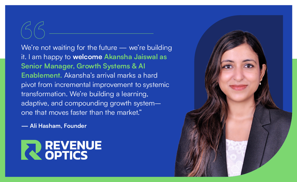 MEMPHIS, Tenn. - ncarol.com -- Revenue Optics today announced a sweeping investment in AI and automation infrastructure, signaling a decisive break from business-as-usual across the industrial distribution sector. The firm has appointed Akansha Jaiswal as Senior Manager, Growth Systems & AI Enablement, a newly created leadership role charged with building the intelligent operating system for B2B growth.