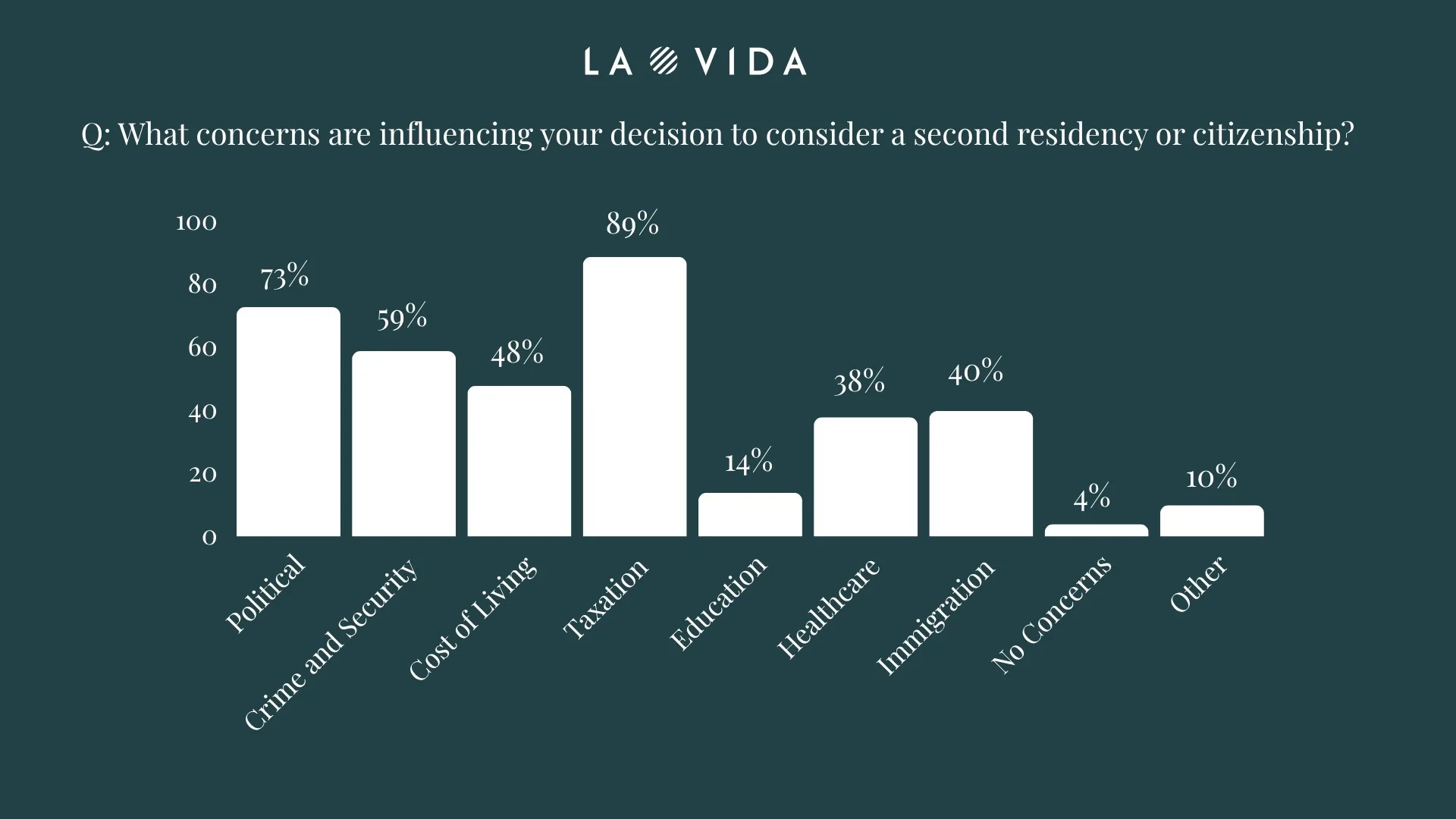 Asked which concerns were influencing their decision to consider overseas residency or citizenship, 88.9% of respondents cited taxation, making it the strongest driver of outward interest. Political concerns followed at 72.8%, while nearly 60% listed crime and security—a surprisingly high figure compared to a recent equivalent U.S. survey.
