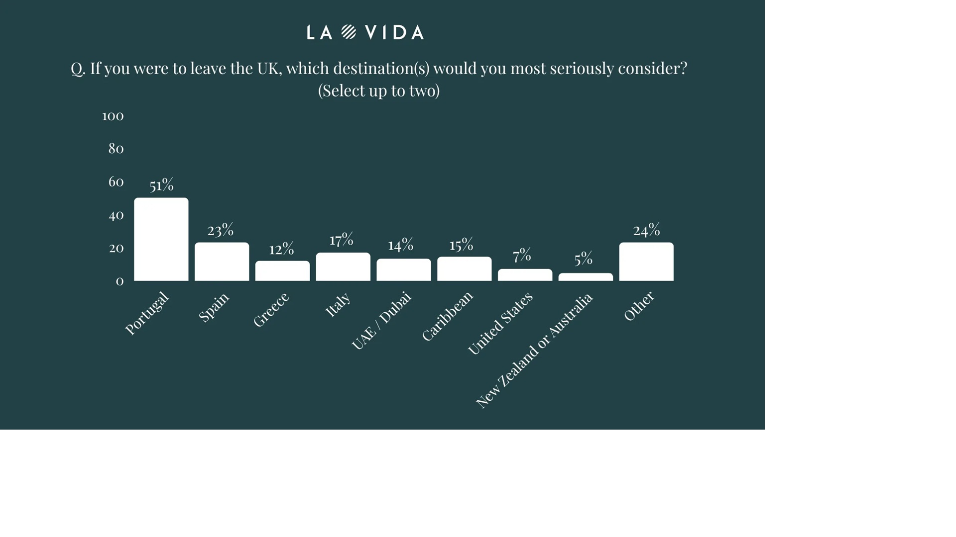 When respondents were asked which destinations they were seriously considering, Portugal emerged as the clear leader, selected by 50.6% as one of their top choices. Spain (23.5%), Italy (17.2%), and the UAE (13.6%) followed.