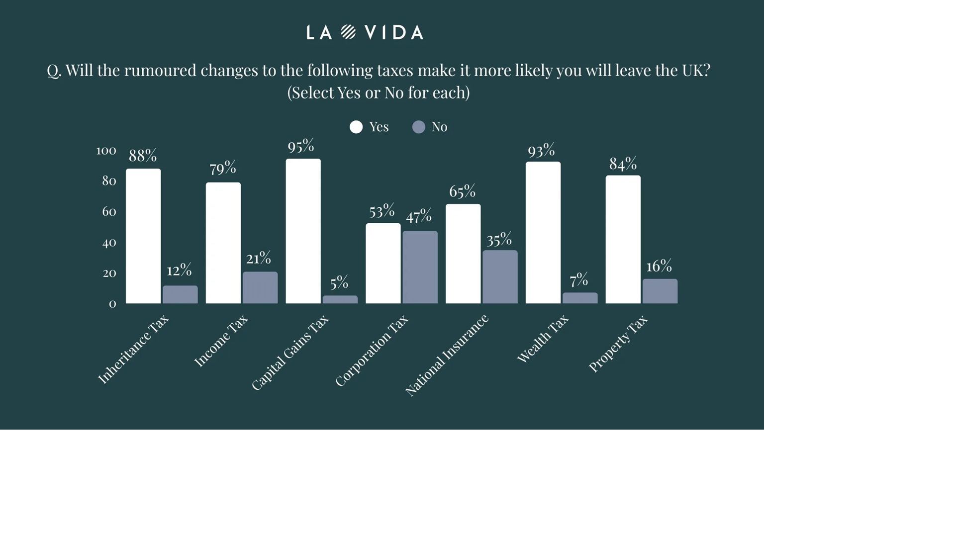 When asked which potential tax changes would make them more likely to leave, 94.7% pointed to Capital Gains Tax increases, followed closely by Wealth Tax at 92.7%. Even Corporation Tax—while the lowest of the group—was cited by over half (52.5%) of respondents.