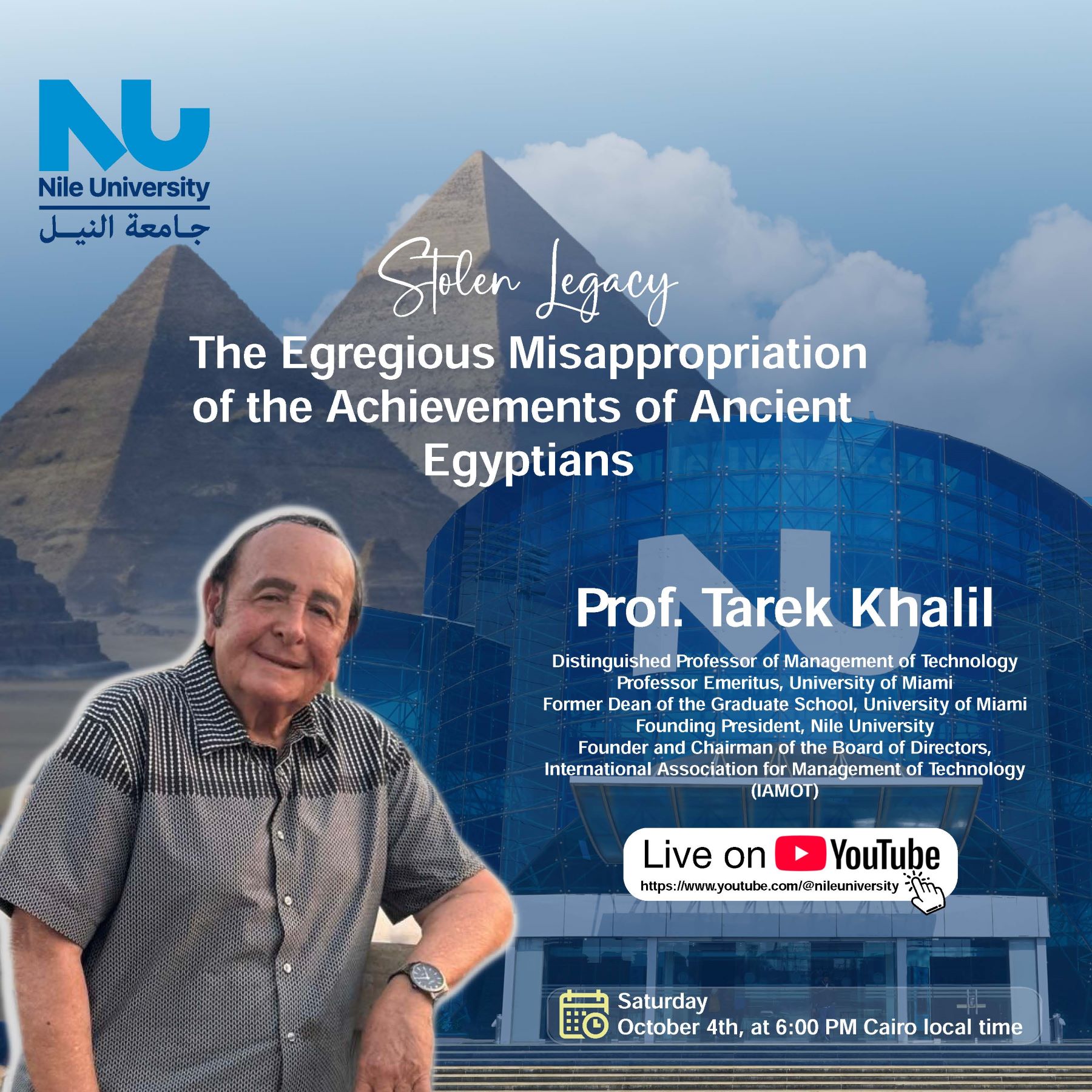 Prof. Khalil, Founder of the International Association on Management of Technology (IAMOT), will explore how historical narratives around the 'discovery' of innovation and technology have been shaped and misrepresented over time – often attributed to other societies and whitewashing Ancient Egypt's history. His lecture will highlight the groundbreaking contributions of Ancient Egypt to knowledge and innovation, far beyond what is already known, reaffirming Egypt's rightful place as a cradle of civilization.